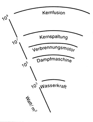Ein leicht verfügbares grobes Maß dafür, wie ein solches Potential anwächst, besteht in der Vorstellung einer Erhöhung der „Energieflußdichte“ pro Kopf und Quadratkilometer pro Sekunde. Das bedeutet ein Fortschreiten von einfacher Sonnenstrahlung, die auf die Erdoberfläche trifft, zum Verbrennen von (nacheinander) Gestrüpp und Schnittholz, Holzkohle, Kohle, Erdgas, Öl, bis zur Kernspaltung, Kernfusion usw.