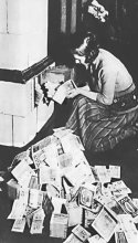1923 finanzierte die Reichsbank die Versailler Schulden indem sie Geld druckte. Am Ende konnten die "Milliardäre" das wertlose Geld als Heizmittel verwenden. Wenn die Menschheit eine Zukunft haben soll, brauchen wir andere Energieträger - im Bild rechts Angra 2, ein Kernkraftwerk in Brasilien.