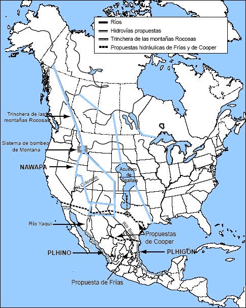 In den 60er Jahren wurde im gleichen Geist ein Plan erstellt, der mit öffentlichen und privaten Mitteln große Mengen Wasser aus den Flüssen Alaskas und dem Norden Kanadas in die riesigen Regionen der Großen Amerikanischen Wüste transferieren sollte, die sich durch den Südwesten der USA bis hinunter in den mittleren Norden Mexikos erstreckt. Dieses Projekt ist als NAWAPA bekannt, die nordamerikanische Wasser- und Energie-Allianz.