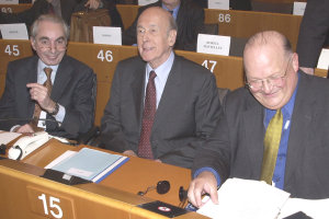 Der Vorstand des Europäischen Konvents bei dessen Eröffnungssitzung (v.l.): Giuliano Amato (stellv. Vors.), Valéry Giscard d'Estaing (Vors.), Jean-Luc Dehaene (stellv. Vors.).