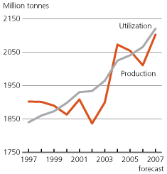 Graphik aus dem FAO-Bericht „Ernteaussichten und Ernährungslage“ (Februar-Ausgabe 2008). Die Welterzeugung von Getreide lag insgesamt in sieben der letzten zehn Jahre unter dem Verbrauch des jeweiligen Jahres.