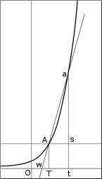 Wenn die Punkte A und a auf der Kurve nebeneinander liegen, d.h., wenn es keinen Abstand zwischen ihnen gibt, wird die Linie AW zur Tangente der Exponentialkurve am Punkt A. Und weil diese Kurve unter Verwendung von Zweierpotenzen konstruiert wurde, gilt auch, daß AT = y sein wird, wenn OT = x ist. Daher wird unser Verhältnis zu
