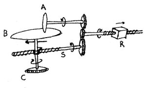 Wenn sich also, wie in der abgebildeten Maschine, die beiden Zahnräder A und B relativ zueinander bewegen können, ist ihr Übersetzungsverhältnis variabel. Wenn man Zahnrad A = y und Zahnrad B = x setzt, wird dieses veränderliche Übersetzungsverhältnis dy/dx. Wenn dieses variable Übersetzungsverhältnis von der Bewegung des Zahnrads y bestimmt und mit Hilfe einer Schraubenführung S übertragen wird, wird unser veränderliches Übersetzungsverhältnis gleich der horizontalen Verschiebung dieser Schraubenführung, also gleich der Rotation y. Wenn die Rotation x bei C konstant gehalten wird, ergibt sich die Beziehung dy/dx = y, wie sie oben in unserer Exponentialkurve ausgedrückt ist.