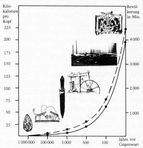 Die Grafik von Abbildung 4 zeigt sowohl das Bevölkerungswachstum als auch die Zunahme des Kalorienverbrauchs pro Kopf über 1 Mio. Jahre. Wenn auch lokale und zeitliche Einbrüche hier nicht beachtet werden, treffen wir wieder auf eine geometrische Kurve. Weil die Erfindungskraft des Menschen nicht bei den Steinwerkzeugen stehen blieb, sondern sich von verbesserten Jagdmethoden über die Landwirtschaft zur Entdeckung von Kohle und Öl zur Kernspaltung und Kernfusion gegen die „ewig Gestrigen“ durchkämpfte, stehen wir heute z.B. vor der großartigen Aufgabe, den Weltraum zu besiedeln.