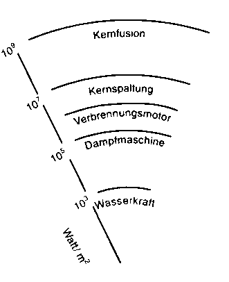 Warum müssen 75.000mal weniger Lasten für die gleiche Energieleistung von 1.000 MW bewegt werden, wenn man statt Kohle Uran benutzt? Die Energieflußdichte fossiler Energie wie der Kohle liegt bei 10 Tausend Watt/m², die der Kernspaltung bei 10 Millionen Watt/m². In etwa 30-40 Jahren erreichen wir Energieflußdichten von Milliarden Watt/m², wenn wir in der Kernfusion Wasseratome verschmelzen können wie in der Sonne. Dann wird Wasser unser Hauptenergieträger werden. Daraus entspringen wieder neue Generationen von Technologien, wie es die Vergangenheit zeigt.