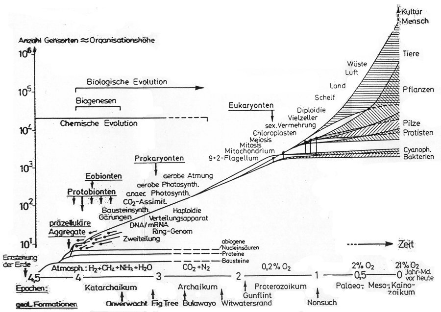 Abbildung 1 zeigt ein hypothetisches Schema der Evolution anhand der steigenden Organisationshöhe von Gensorten. Zum einen fällt die geometrische Form der Kurve auf, die darauf hinweist, daß dieses Wachstum der letzten 4 Mrd. Jahre nicht eine einfache lineare Aneinanderreihung, keine einfache Addition war. Stellen sich aber unsere Zeitgenossen unter Wachstum nicht genau diese primitive Aneinanderreihung vor, wie sie von Ökologiegurus in Schreckensbildern der Überbevölkerung, Müllbergen und überquellenden Großstädten aufgebauscht werden? In der Natur sind wohl ganz andere Wachstumsprozesse vorherrschend. Dort sehen wir Sprünge zu höherer Organisationshöhe, die aber selbst wieder „unregelmäßig“ stattfinden. Es fanden ausgesprochene Revolutionen statt, als z.B. die Photosynthese oder der Mensch auftraten. Es entstanden bisher nie dagewesene neue Prozesse wie die Erzeugung von Sauerstoff mit der Photosynthese, der für die damalige Umwelt gewiß ein Gift war und viele andere Zellen tötete. Glücklicherweise gab es damals noch keine Umweltschutzbewegung, die den Sauerstoff verbot.