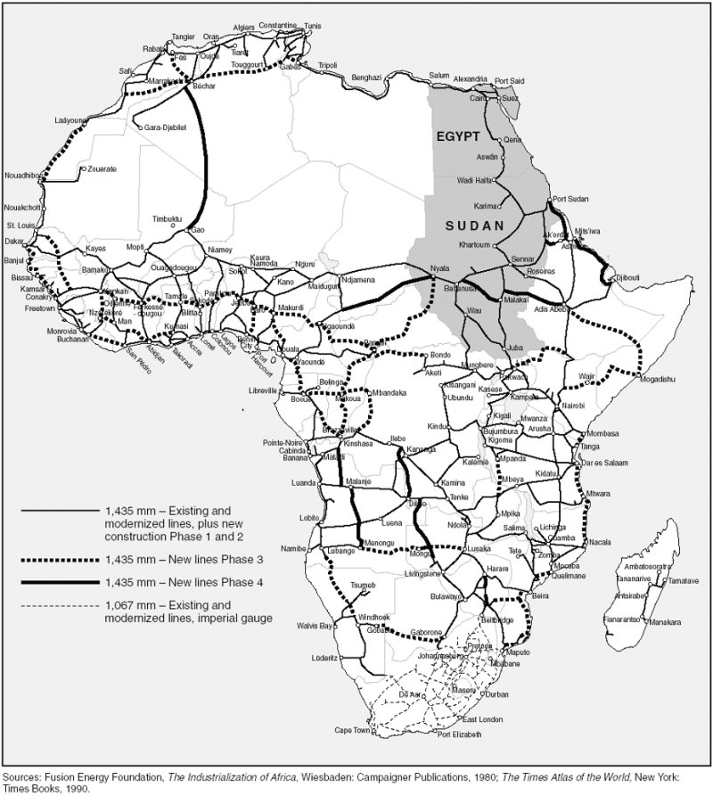Afrikas derzeitiges Eisenbahnnetz ist das Erbe des Kolonialismus. 1978 beauftragte Lyndon LaRouche ein Team der Fusion Energy Foundation damit, in einer Studie die Grundvoraussetzungen für die Industrialisierung des Kontinents zu definieren. Das vorrangigste Element, das in der Studie betont wurde, war der Bau eines transkontinentalen Schienennetzes, das die Entwicklung der inneren Regionen und die Anbindung wichtiger Küstenstädte erlaubte. Die Vorschläge stützten sich auf Pläne und Studien, die afrikanische Regierungen und Organisationen bereits vorgelegt hatten. Während einige Länder wie China und Japan mit Afrika an Entwicklungsprojekten arbeiten, um - wie sich der japanische Ministerpräsident Fukuda ausdrückte - „Schulter an Schulter mit der afrikanischen Bevölkerung voranzuschreiten“, schafft die alte koloniale Nemesis, das britische Weltreich, politische und wirtschaftliche Instabilität - nach wie vor sehr konkret, wie sich am britischen Vorgehen gegen die Regierung Mugabe in Simbabwe zeigt.