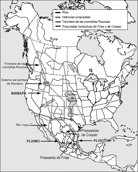 Noch ehrgeiziger ist „NAWAPA-Plus“, ein auf 30 Jahre angelegtes Projekt, das NAWAPA mit zwei großen wasserwirtschaftlichen Vorhaben in Mexiko verbindet: Dem Wasserplan für den Nordwesten (PLHINO) und für den nördlichen Golf (PLHIGON). Beide Projekte wurden bereits in den 60er und 70er Jahren erdacht und ausgearbeitet. Der heutige Plan basiert auf den Entwürfen des mexikanischen Ingenieurs Manuel Frias Alcaras. Nord-, Mittel- und Nordwestmexiko, wo 77% der Bevölkerung leben, verfügt über 32% des vorhandenen Wassers, während die kleineren südöstlichen Landesteile 68% des Wassers, aber nur 23% der Bevölkerung haben. PLHINO sieht vor, den Abfluß von fünf Flüssen an Mexikos zentraler Pazifikküste aufzufangen und über Kanäle, Dämme, Tunnel und Pumpstationen in den Yaqui-Fluß im Norden umzuleiten. Der größte Teil des Wassers soll für die Bewässerung in der Landwirtschaft eingesetzt werden. Die Gesamtkosten werden bei einer Bauzeit von 10 Jahren auf 10 Mrd. Dollar veranschlagt. PLHIGON wurde entworfen, um die regelmäßigen Überschwemmungen in Tabasco zu verhindern, Wasserkraftanlagen zu bauen, die Grundwasserleiter aufzufüllen und Frischwasser an der mexikanischen Golfküste nördlich bis zur texanischen Grenze und westlich in die Mitte und den Norden Mexikos zu leiten - in das Gebiet der Großen Amerikanischen Wüste. Durch diese Maßnahmen könnten 1,5 Mio. Hektar Land für die landwirtschaftliche Nutzung zurückgewonnen werden.