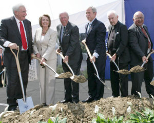 Der frühere US-Außenminister George Shultz (hier 3. v.l.) neben Präsident Bush bei der Grundsteinlegung für den Neubau des US-Instituts für den Frieden.