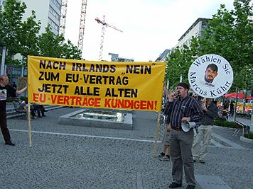 Die LaRouche-Jugendbewegung feierte am letzten Mittwoch den Erfolg der Kampagne gegen den Lissaboner Vertrag, nachdem die Iren den Vertrag in der Volksabstimmung mehrheitlich abgelehnt hatten. Als nächster Schritt müsse man nun auch die Verträge von Maastricht, Amsterdam und Nizza kündigen und zum Konzept eines „Europa der Vaterländer“ zurückkehren, wie es de Gaulle und Adenauer vorschwebte. Im Bild am Megaphon: der Dresdener Oberbürgermeisterkandidat der BüSo, Marcus Kührt, der sich am 22. Juni dem zweiten Wahlgang stellte - das Ergebnis stand bei Redaktionsschluß noch nicht fest.