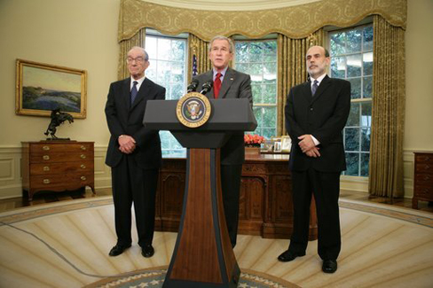 Präsident Bush mit seinem alten und seinem neuen Wirtschaftsguru, dem früheren Vorsitzenden der Federal Reserve Alan Greenspan (links) und dessen Nachfolger Ben Bernanke (rechts): Klüger ist er nicht geworden.