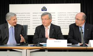 Drei, die sich der Realität nicht stellen: Der Präsident der Europäischen Zentralbank, Jean-Claude Trichet, der Vorsitzende der „Eurogruppe“, Jean-Claude Juncker und der Wirtschafts- und Währungskommissar der EU, Joaquin Almunia.
