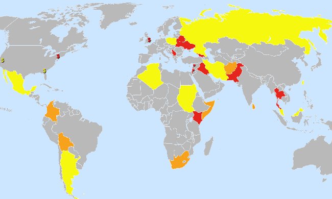 Diese Karte zeigt das Muster von Destabilisierung, Chaos und Krieg in aller Welt, das sich in den
