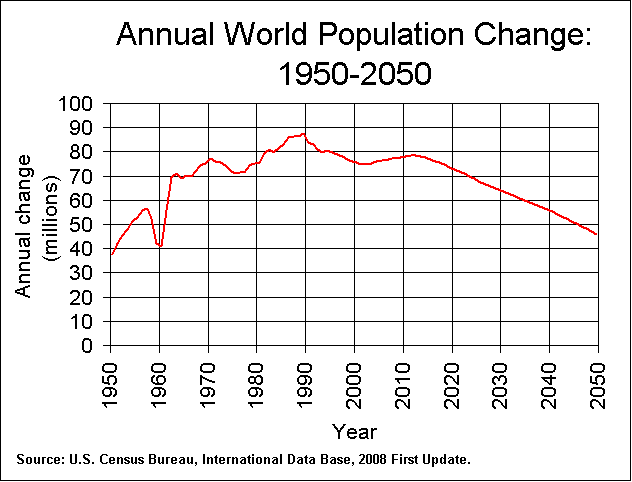 Die jährliche Vermehrung der Weltbevölkerung fiel bis 1998 auf nur noch 79 Mio. Die Prognose des Amtes sagt eine starke Abnahme nach 2013 voraus, was zu einer jährlichen Zunahme von nur 40 Mio. führen wird, die gleiche Zahl wie 1950.