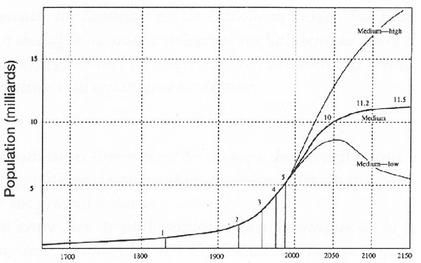 2. Die „mittlere“ Variante würde im Jahr 2050 etwa 9,8 Mrd. Menschen erreichen und die Weltbevölkerung ab dann auf ca. 11,5 Mrd. im Jahr 2150 „stabilisieren“.