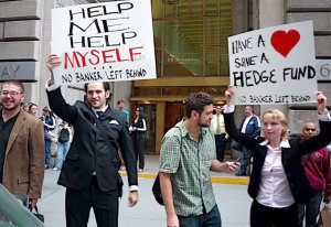 “Helft mir, mich selbst zu bedienen“ - „Hab’ ein Herz, rette einen Hedgefonds“: Demonstranten protestieren an der Wall Street gegen den Bankrettungsplan der US-Regierung. Aber der grimmige Humor könnte bald der Wut Platz machen.