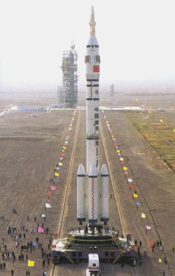 Die Shenzhou-5-Mission vor dem Start im chinesischen Raumfahrtzentrum Jiuquan.