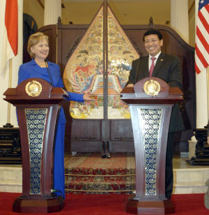 US-Außenministerin Hillary Clinton mit ihrem indonesischen Amtskollegen Hassan Wirajuda bei ihrer gemeinsamen Pressekonferenz in Jakarta.