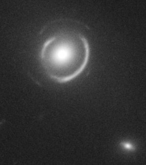 Ein „doppelter Einsteinring“, entdeckt mit dem Hubble-Teleskop. Diese optische Täuschung entsteht durch die Beugung des Lichts im Schwerefeld einer sog. „Gravitationslinse“ - eines Sternes, der zwischen dem Beobachter und dem beobachteten Himmelskörper steht, der auf diese Weise zu einem Ring verzerrt erscheint.