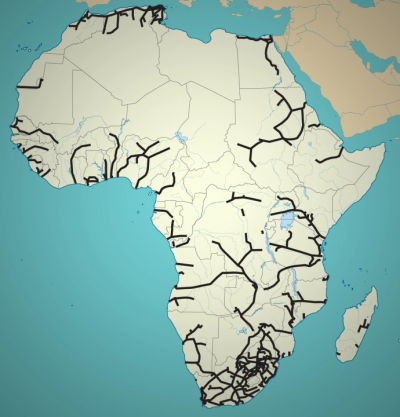 Das heutige Eisenbahnnetz Afrikas (oben) ist genaugenommen gar kein Netz, da die Linien in der Regel nur von bestimmten Rohstoffvorkommen zum nächsten Hafen führen und keine einheitliche Spurweite haben. Ein künftiges Eisenbahn- bzw. Magnetbahnnetz (unten) sollte daher von vornherein als ein einheitliches Netz geplant und komplett neu gebaut werden.