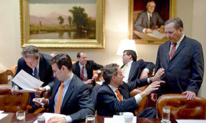 Larry Summers (stehend) dominiert den Wirtschafts- beraterstab des Präsidenten