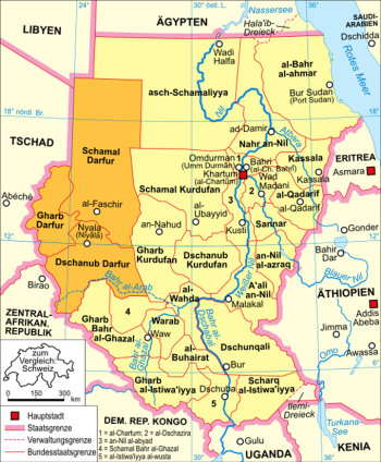 Die Bundesstaaten des Sudan. Links hervorgehoben die drei Bundesstaaten der Region Darfur.