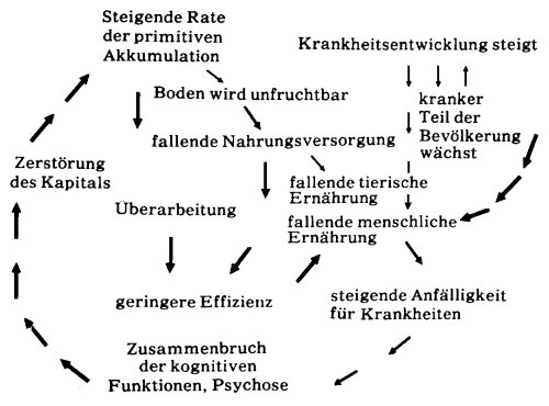 Wenn wir abschließend den Gesamtprozeß der ökologischen Katastrophe betrachten, sehen wir eine Folge von wechselseitig verknüpften Zyklen: Die abnehmende Fruchtbarkeit des Bodens führt zu einer Senkung der Nahrungsversorgung, was zu schlechterer Ernährung sowohl von Menschen als auch von Tieren führt. Das verringert die Effizienz des menschlichen Stoffwechsels und damit die Ausnutzung der Nahrung durch den Körper; es gibt mehr Kranke, die menschliche Ernährung wird schlechter, und die Anfälligkeit für Krankheiten steigt. Der Gesamtkreislauf führt zum allgemeinen Zusammenbruch der Denkfähigkeit der Bevölkerung, zur Massenpsychose, dem Zusammenbruch der Industrie, der Zerstörung des Reichtums. (...)