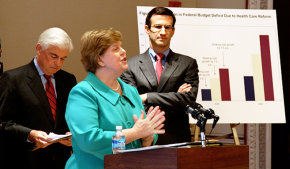 Die Vorsitzende des Wirtschaftsbeirates von Präsident Obama, Christina Romer, bei der Vorstellung der dramatischen Kürzungsvorschläge für das amerikanische Gesundheitssystem. Rechts neben ihr: Peter Orszag, Direktor des Haushalts- und Verwaltungsamtes.