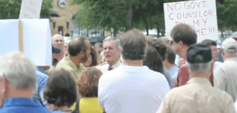 Der Abg. Lloyd Doggett aus Austin Texas (Bildmitte, umringt von wütenden Bürgern) mußte eine Veranstaltung abbrechen, nachdem er den Fehler gemacht hatte, sich für Obamas Gesundheitspläne auszusprechen.