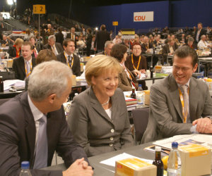 Wirtschaftsminister von und zu Guttenberg (rechts) ließ, wie unter Bundeskanzlerin Angela Merkel (Mitte, mit CSU-Landesgruppenchef Ramsauer beim CDU-Parteitag 2007) üblich, das neue Insolvenzgesetz nicht von seinen Ministerialbeamten, sondern von externen Beratern ausarbeiten - in diesem Fall der britischen Anwaltskanzlei Linklaters.