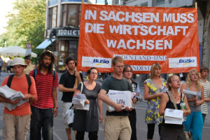 Ein Wahlkampfteam der BüSo demonstriert in Leipzig für den Wiederaufbau der sächsischen Wirtschaft.