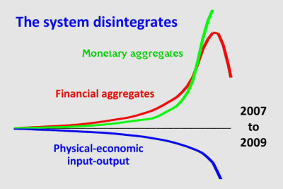 Wir sind nun in einer Zeit angelangt, in der... die Finanzaggregate abnehmen. Dieses Schrumpfen der Finanztitel, das erst in der jüngsten Zeit begonnen hat, steht für das Einsetzen der Zusammenbruchskrise...