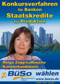 Das Patentrezept der BüSo-Bundes- vorsitzenden Helga Zepp-LaRouche: Konkursverfahren für Banken, Staatskredite für Produktion.