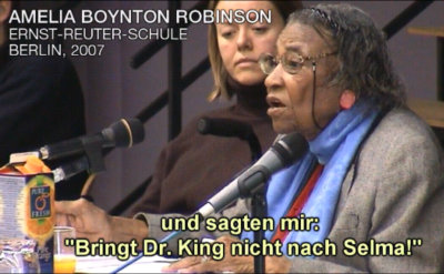 Amelia Boynton-Robinson: „Diese Rassisten riefen mich an und sagten mir: ‘Bringt Dr. King nicht nach Selma! Weil er ein Kommunist ist, ein Aufwiegler und Agitator.’ Und jeder hatte Angst vor ihm. Und man kann sich ja kaum vorstellen, wie jemand Angst haben kann, obwohl er nichts über die Person weiß.“