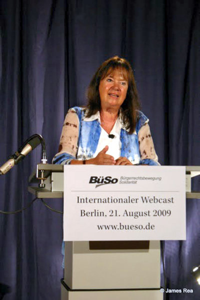 Helga Zepp-Larouche: „Und deshalb kandidiere ich als Kanzlerkandidatin. Nicht weil ich denke, daß ich so unter normalen Bedingungen große Chancen hätte. Aber wir haben keine normalen Bedingungen. Und die BüSo ist die einzige Partei, die sich mit einer Ursachenanalyse beschäftigt, die seit langem eine Lösung für diese Krise hat und die auch den Mut hat, Sachen anzusprechen - was andere nicht haben. Und deshalb: wenn sie etwas für ihre Zukunft tun wollen, dann helfen Sie uns bei dieser Mobilisierung. Denn wir gehen auf Wochen und Monate zu, da wird den Leuten Hören und ... alles vergehen. Das wird viele Leute schockieren. Und wir sind eine Kraft, die die Leute in gewisser Weise darüber informieren muß, daß es eine Lösung gibt. Und wenn wir irgend etwas aus der Depression der 30er Jahre gelernt haben: damals hat Roosevelt es geschafft, Amerika aus der Depression zu führen; und in Europa gab es keine soziale Bewegung, die in der Lage gewesen wäre, die Gefahr von Faschismus aufzuhalten - und das müssen wir diesmal anders machen!“