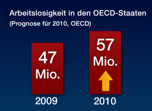Dann, wenn man jetzt die Prognose anschaut, alleine nur von dem, was öffentliche Zahlen bis jetzt sind: Industriearbeitsplätze in Gefahr: weitere 250.000. Die Arbeitslosigkeit in den OECD-Staaten: die Prognose ist praktisch bis 2009 47 Millionen Arbeitslose, bis 2010 57 Millionen Arbeitslose. Die Arbeitslosigkeit in den OECD Staaten ist seit Ausbruch der Finanzkrise um 45% gestiegen. Die Stahlproduktion in Deutschland ist um 50% seit 2008 herunter gegangen, d.h., wir haben schon einen ganz massiven Einbruch.