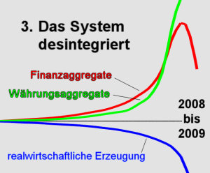Die grüne Kurve sind die Währungsaggregate, das ist einfach das Geld, die Liquidität, die in Umlauf ist, und die nimmt seit langem hyperbolisch zu, und die hat sich, wie sie sehen können, vollkommen von der realen Produktion verselbstständigt, die haben also überhaupt nichts mehr miteinander zu tun.
