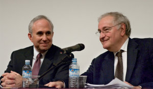 Lyndon LaRouches Sprecher für den Westen der Vereinigten Staaten, Harley Schlanger (links), bei der Veranstaltung in Paris mit dem Vorsitzenden der Solidarité et Progrès, Jacques Cheminade.