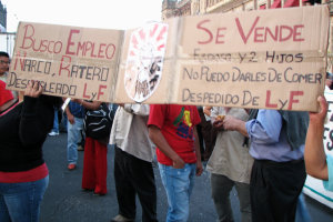 Demonstration der Elektrizitätsarbeiter am 15. Oktober: Links: “Suche Arbeit: Sei es Drogenhändler oder Langfinger. Bin arbeitslos, vorher bei Luz y Fuerza” - Rechts: “Zu verkaufen: Frau und zwei Kinder. Ich kann sie nicht ernähren. Bin Entlassen, vorher bei LyF.”