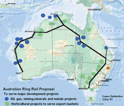 Der „große australische Eisenbahnring“ würde riesige Gebiete mit großen Rohstoffvorkommen erschließen, und mit den Bevölkerungszentren im Süden und mit dem Hafen Darwin im Norden verbinden.