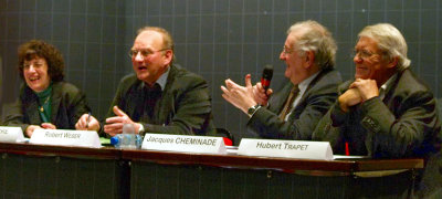 Die Redner der Pariser Konferenz: Christine Bierre von der Solidarité et Progrès, Robert Weber, 1986-2008 Bürgermeister von Abreschwiller/ Moselle, der frühere Präsidentschaftskandidat Jacques Cheminade und der Bürgermeister von Pontigny/ Yonne, Hubert Trapet.