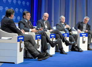 Nicht alle wollen über LaRouches Vorschläge diskutieren: (v.l.:) Josef Ackermann (Deutsche Bank), José Barroso (Europ. Kommission), Premierminister Fredrik Reinfeldt (Schweden), Jean-Claude Trichet (EZB) und Wirtschafts- und Finanzminister Giulio Tremonti (Italien) beim „Weltwirtschaftsforum“ in Davos.