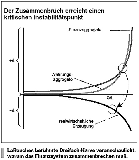 Diese Unmöglichkeit ist der eigentliche Grund des derzeitigen Finanzkrachs. Nicht einzelne Spieler am Markt haben sich verspekuliert, sondern sie haben durch ihre Machenschaften die gesamte Realwirtschaft finanziell so ausgesogen und schrumpfen lassen, daß deren Fähigkeit, die Finanzblase als ganze weiter aufzupumpen, immer mehr und immer schneller verloren ging; infolgedessen platzte die Blase. Ich verweise in diesem Zusammenhang auf Lyndon LaRouches „Tripelkurve“ (Abb. 1), die diesen Prozeß versinnbildlicht.