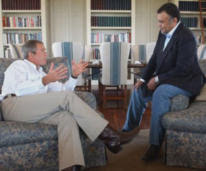 Durch den Ölschwindel von 1973 wurde Saudi- Arabien integraler Bestandteil des anglo- holländisch-saudischen Empire: Der saudische Prinz Bandar im Gespräch mit dem damaligen US-Präsidenten George W. Bush.