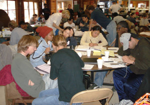Gruppenarbeit an der Astronomia Nova. Mehrere Dutzend junge Leute arbeiteten sich Ende 2006 gemeinsam durch eine Präsentation des erstens Teils