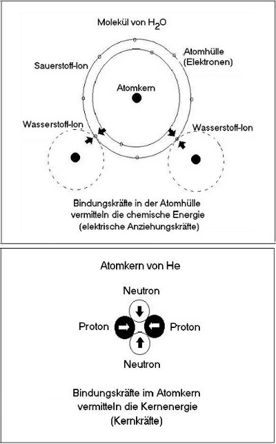 2. durch die Bindungskräfte, welche die Teilchen im Atomkern (die Protonen und Neutronen) zusammenhalten; das ist die vor etwa hundert Jahren entdeckte Kernenergie, die z. B. in Kernkraftwerken genutzt wird.