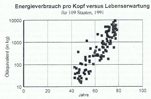 Energie ist lebensnotwendig. Es gibt kein Leben ohne Energie; nicht einmal in primitivster Form. Sie ist also äußerst kostbar! Wie wichtig Energie für unser Leben ist, zeigt ein Schaubild aus dem Menschheitsentwicklungsbericht 1994 der Vereinten Nationen (Abb. 1). Für 109 Staaten ist dort jeweils der gewerbliche und industrielle Energieverbrauch pro Kopf der Lebenserwartung der Bevölkerung gegenübergestellt. Auch wenn es dabei eine gewisse Streuung gibt, ist eines deutlich: Eine hohe Lebenserwartung hat die Bevölkerung nur in Ländern mit hohem Energieeinsatz pro Person. Wo nicht genügend Energie zur Verfügung steht, müssen die Menschen viel früher sterben, einfach weil die gegebenen Lebensumstände ihre Gesundheit übermäßig strapazieren und weil ihnen wegen fehlender Infrastruktur selbst in höchster Not nicht die nötige Hilfe zugänglich ist. Die christliche Reaktion darauf ist: Menschen in Not brauchen Hilfe.