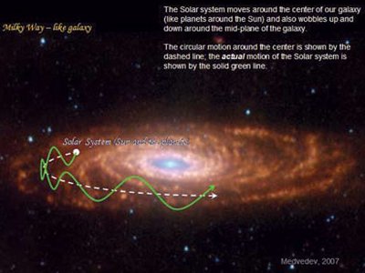 Bewegung des Sonnensystems auf dem Weg um das Zentrum der Milchstraße. Durchquert es einen der Spiralarme, wo die Dichte der Materie größer ist, steigt die Intensität der kosmischen Strahlung. Dies erzeugt einen 140-Millionen-Jahre-Zyklus, der sich z.B. in Kälteperioden zeigt. Gleichzeitig erzeugt das Auf- und Abschwingen des Sonnensystems auf seinem Weg den in Abb. 3 beschriebenen 60-Millionen-Jahre-Zyklus.