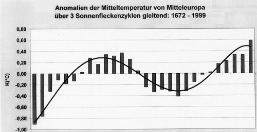 Abb. 10: Anomalien der Mitteltemperatur von Mitteleuropa über drei Sonnenfleckenzyklen gleitend, 1672-1999.