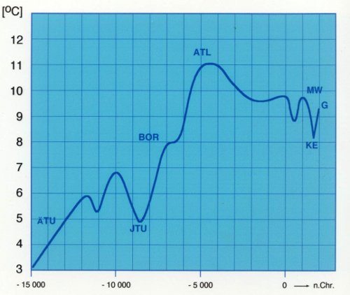 Auch nach der Eiszeit hat sich unser Klima permanent gewandelt (Abb. 3). Sehen Sie, das ist hier unten unser Raum, also nach der Eiszeit, nachdem das Eis sich zurückgezogen hatte. Wir hatten hier Klimabedingungen wie die Tundra von Lappland, oder Nordsibirien oder Nordkanada; solche klimatischen und auch Vegetationsverhältnisse hatten wir.